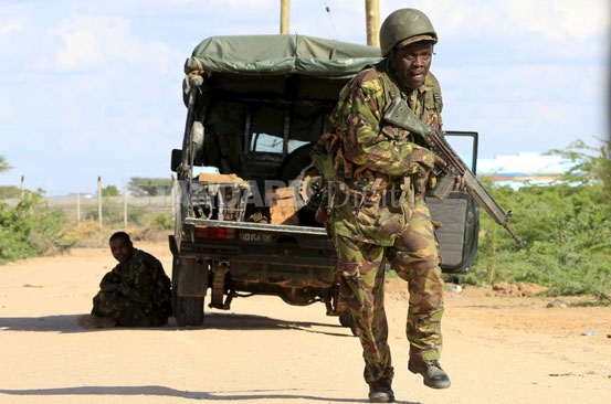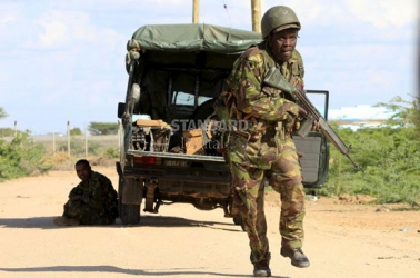 A Kenya Defense Force soldier runs for cover near the perimeter wall where attackers are holding up at a campus in Garissa April 2, 2015.