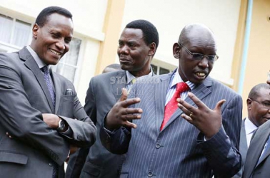 Education Cabinet Secretary Jacob Kaimenyi (left), Principal Secretary Belio Kipsang (right) and Nathan Baraza at a forum to review selection rules Thursday. [PHOTO: MOSES OMUSULA/STANDARD]