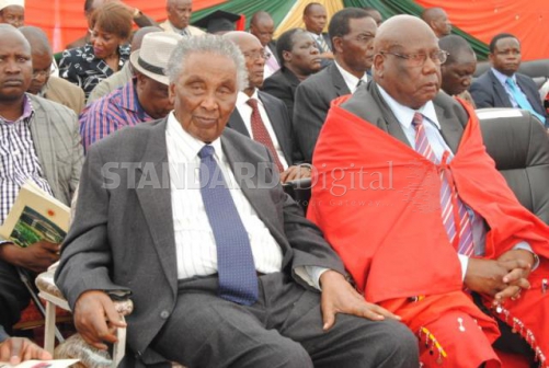 Former Heritage Minister and veteran Narok politician William Ole Ntimama (left), with Jomo Kenyatta University of Agriculture and Technology (JKUAT) Chancellor Professor Geoffrey Moriaso Ole Maloiy at Maasai Mara University on December 10,2015.He asked the university to venture into herbal medicine research.PHOTOS:ROBERT KIPLAGAT