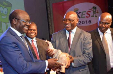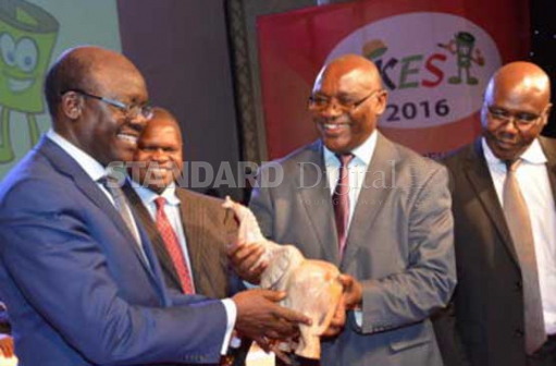 Kisii County governor James Ongwae (middle) flanked by his deputy Joash Maangi and speaker Kerosi Ondieki presents a soapstone carving to Secretary General, UNCTAD Dr. Mukhisa Kituyi on the second day of the county's Entrepreneurship Summit at Kisii University on February 26,2016. A number of investors have shown interest in investing billions of shillings in the area. PHOTO: DENISH OCHIENG/ STANDARD
