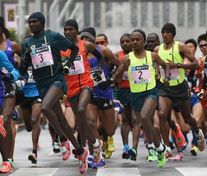 Invited athletes, Stephen Kiprotich of Uganda (L, 3), Dickson Chumba of Kenya (2nd L, 4), Tsegaye Kebede of Ethiopia (5th R, 2) and Endeshaw Negesse of Ethiopia (3rd R, 5 yellow shirts) start the Tokyo Marathon 2015 withamong other runners in Tokyo on February 22, 2015. More than 35,500 runners took part in the Tokyo Marathon. AFP PHOTO / TOSHIFUMI KITAMURA