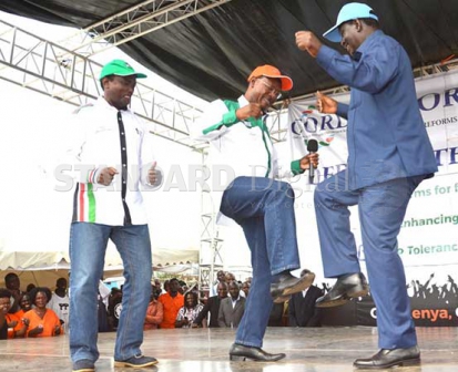 Cord Leaders Kalonzo Musyoka (left) Moses Wetangula (center) and Raila Odinga during a Cord Rally at kamukunji grounds on 23/4/16 [Photo:BEVERLYNE MUSILI/Standard]