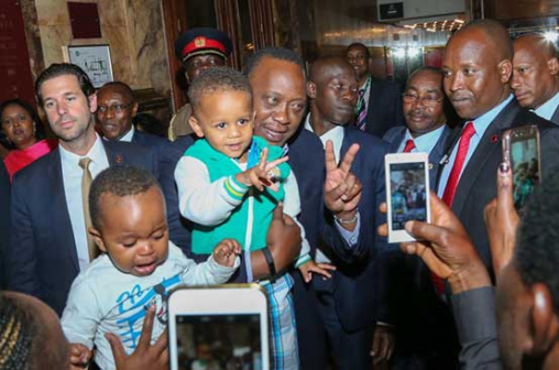 President Uhuru Kenyatta enjoys a moment with a baby during a meeting with Kenyans living in Belgium and Luxembourg at Metropole Hotel Brussels. PHOTO BY PSCU