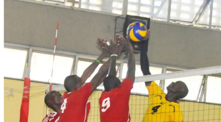 KDF players attempt to block a spike by Charles Lagat (right) of GSU as the Kenya Volleyball Federation play-offs got underway at the KPA Makande GYM. [PHOTO BY GIDEON MAUNDU/STANDARD].