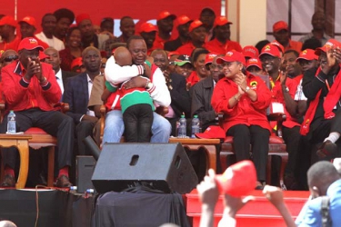 Ryan Mwenda (centre) 8 years, with President Uhuru Kenyatta as Deputy President William Ruto (left) and First Lady Margaret Kenyatta look on during the launch of Jubilee Party at the Kasarani Stadium,Kasarani. (PHOTO: ELVIS OGINA/ STANDARD)