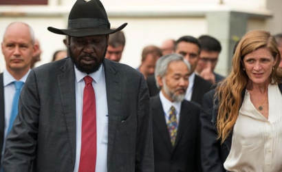 South Sudan’s President Salva Kiir (left) and a delegation from the United Nations Security Council, including US Ambassador to the UN Samantha Power (right) during a tour of the state house, known as j1, to show the damages of fightings from July, on September 4th, prior to a closed-door meeting. [PHOTO: AFP]