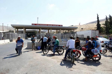 People wait in front of the Turkish Cilvegozu border gate, located opposite the Syrian commercial crossing point Bab al-Hawa, in Reyhanli, Hatay province, Turkey
