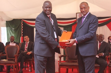 Mr. Silas Mugeria receives long service award from Central Bank of Kenya Governor Patrick Njoroge during the banks 50th anniversary celebration . The lawyer worked for the bank for over 39 years before venturing into private practice