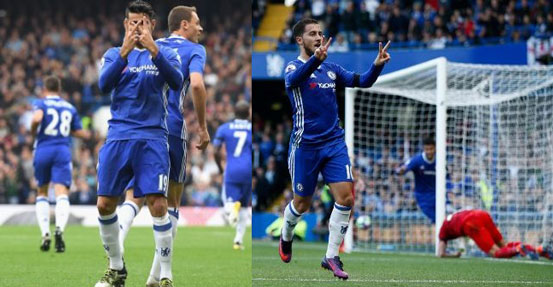 Diego Costa made a W sign after scoring in tribute to missing Chelsea star Willian while Eden Hazard made a 22 sign for Willian’s number