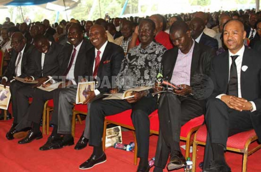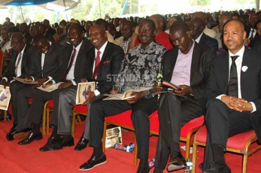 FROM LEFT: Mosop MP Kirwa Bitok, Nandi Senator Stephen Sang, Nandi Governor Cleophas Lagat, Baringo Senator Gideon Moi, CORD leader Raila Odinga, Uasin Gishu Governor Jackson Mandago and businessman Juma Maulidi during the burial of Kanu leader Sarah Jemutai Saina in Kabiyiet, Nandi County yesterday. [PHOTO:PETER OCHIENG/STANDARD]
