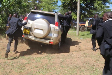 Kitui Governor Julius Malombe flees in his official car during the burial of former mayor Martha Mwangangi at Kyanika village, Kitui East on December 23, 2016. Ms Mwangangi was killed by county government fire engine truck on December 16, 2016 during traders' demonstrations in Kitui town. Photo Paul Mutua