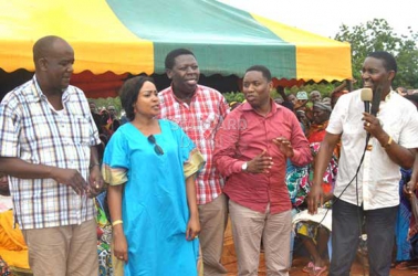 Cabinet Secretary for Devolution Mwangi Kiunjuri , flanked by among others his Mining collegues Dan Kazungu (right), Irrigation Eugene Wamalwa (3rd right) addresses locals before handing over irrigation equipments to farmers at Malindi's Chakama village in Kilifi County on Friday,07th April,2017. [Photo: Maarufu Mohamed,Standard].