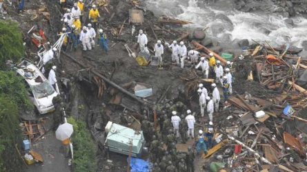 Policemen and members of self-defence forces take part in search operations at a damaged area in the village of Toho, Fukuoka Prefecture, Japan in this photo taken by Kyodo on July 7, 2017. Mandatory credit Kyodo/via REUTERS