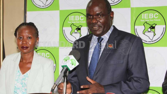 IEBC chairman Chebukati Wafula and Commissioner Dr. Roselyne Akombe addressing the media (Photo: Jenipher Wachie/Standard).