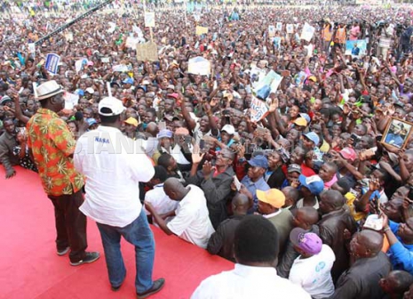 NASA leaders Raila Odinga and Musalia Mudavadi address a campaign rally in Nakuru town yesterday. [Correspondent]