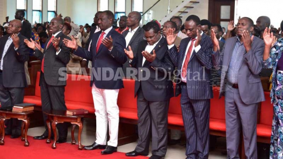 Deputy President William Ruto, (from right ) Senate Speaker Ken Lusaka, Machakos Town MP Victor Munyaka and Kikuyu's MP Kimani Ichungwa during a church service at Chrisco in Vota, Machakos County. PICTURE REBECCA NDUKU/DPPS
