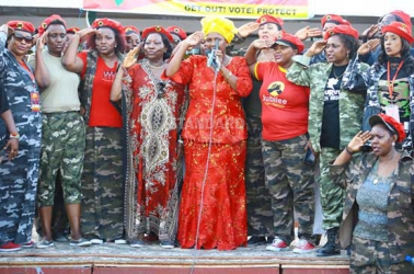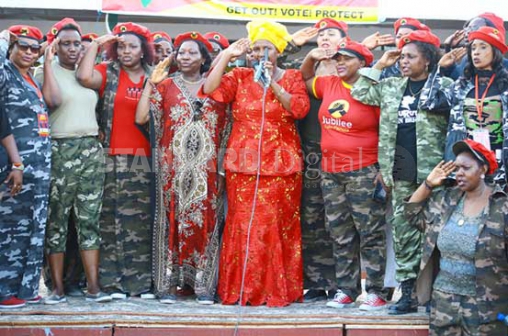 A section of members of Jubilee Party Women Brigade, Mombasa chapter, salute before their meeting at the Mombasa showground in Nyali constituency on Sunday. The campaign meeting was organised by former Mombasa Deputy Governor Hazel Katana. [ Gideon Maundu, Standard]