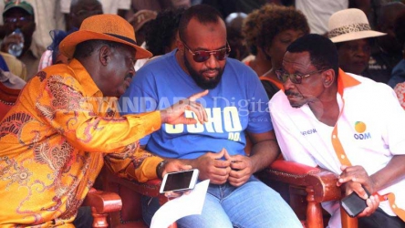 NASA leader Raila Odinga with Mombasa Governor Hassan Joho and Siaya Senator James Orengo in Bondo Siaya County for the requiem mass of three youths who were shot during demos. (Collins Oduor, Standard)