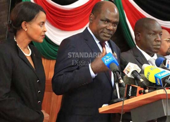 IEBC Chairman Wafula Chebukati with his Vice Consolata Nkatha (left) and Commissioner Paul Kurgat addressing the Press at Bomas of Kenya Nairobi on the current preparation of Presidential elections 25/10/17 [Photo/ Moses Omusula]