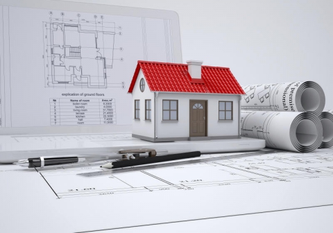 Scrolls architectural drawings and small house. [Photo: Courtesy]