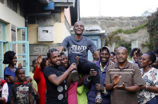 Wambua Ron Kivasu of Lenana School celebrate with family members and friends at home in Nakuru on December 20 after he scored A- of 77 points in the just released KCSE results . [Photo:Kipsang Joseph/Standard]