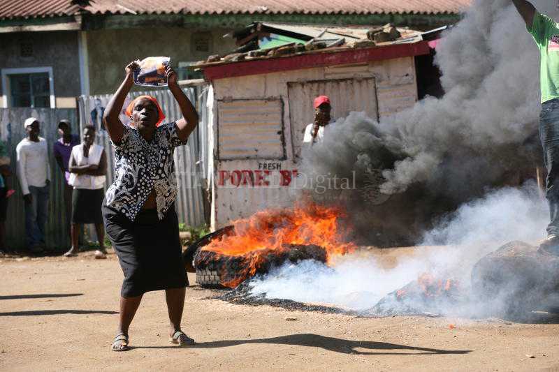 A protester brandishing a portrait of a politician demonstrates near a burning road barricade at Kenya Re area on May 14, 2017 morning. [Photo by Denish Ochieng/Standard]