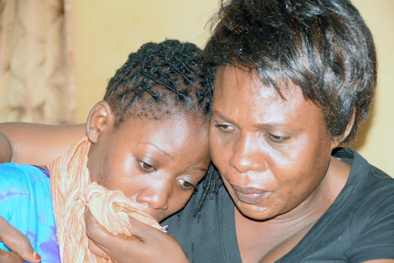 Judy Akinyi (right) consoles her niece Bethlen Anyango (left) whose mother was among the seven relatives who perished in a road accident at Sultan Hamud along the Mombasa-Nairobi Highway at their Mtopanga residential house within Mombasa County as they began to raise funds for their burial. [Photo by Gideon Maundu/Standard]