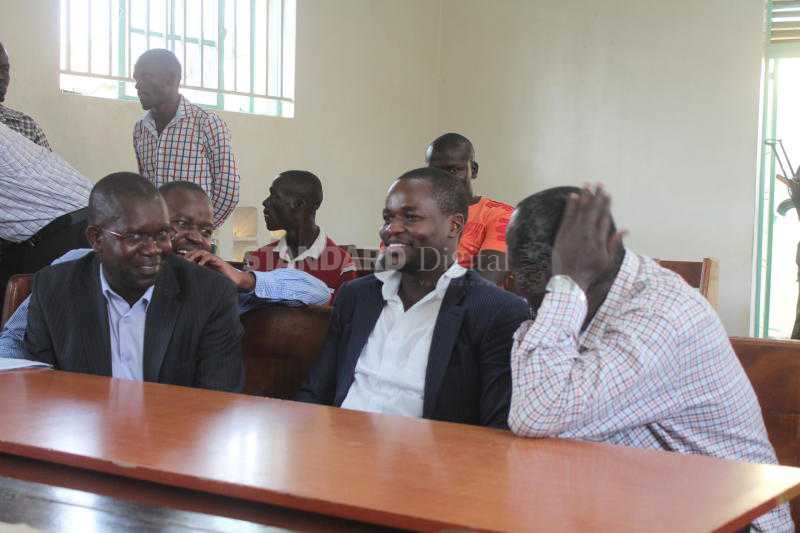From right, former Kasipul MP Oyugi Magwanga , his lawyer Jack Oronga (second right) Homa Bay Governor Cyprian Awiti’s lawyer Emanuel Awiti and IEBC’s lawyer Fredrick Orego at the Homa Bay election court. [Photo by James Omoro/Standard]