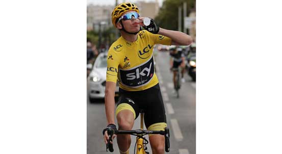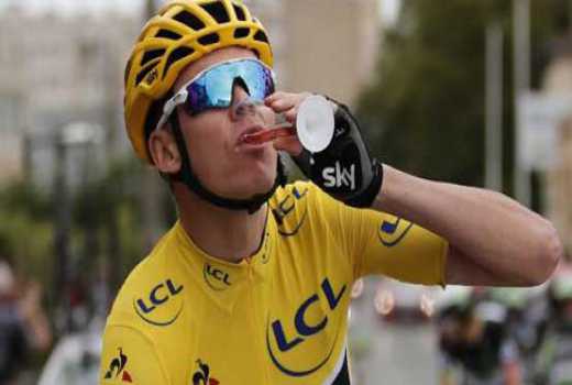 Great Britain's Christopher Froome wearing the overall leader's yellow jersey drinks champagne as he takes the start of the 103 km twenty-first and last stage of the 104th edition of the Tour de France cycling race on July 23, 2017 between Montgeron and Paris Champs-Elysees. / AFP PHOTO