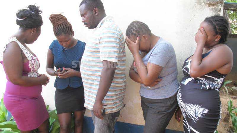 The five suspects paraded at Mtwapa police station in Kilifi County. They are accused of drugging bar patrons before stealing from them. [Maarufu Mohamed, Standard]