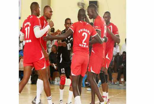 Kenya Prisons men volleyball team players celebrates a point after beating GSU during the Kenya Volleyball Federation National League play-offs at the Makande GYM, November 26, 2016. Prisons won 3-2. [PHOTO BY GIDEON MAUNDU/STANDARD].