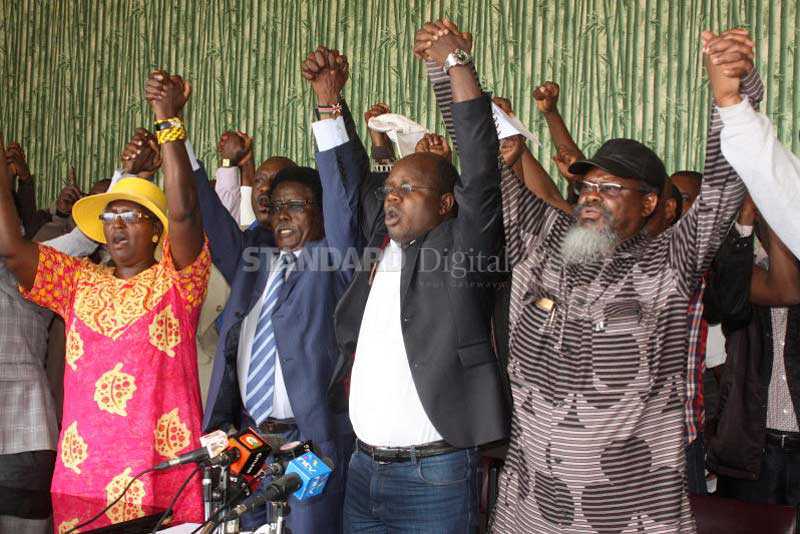 University Academic Staff Union (UASU) Secretary General Constantine Wasonga (second right) after addressing a press conference in Nairobi on March 18 2018, in solidarity with Union's chairman Muga K’Olale (right), Vice chair Joseph Mberia (second left), National Trustee, Njoki Ndungu and other Union members regarding the ongoing lecturer's strike. [Photo by David Njaaga/Standard]