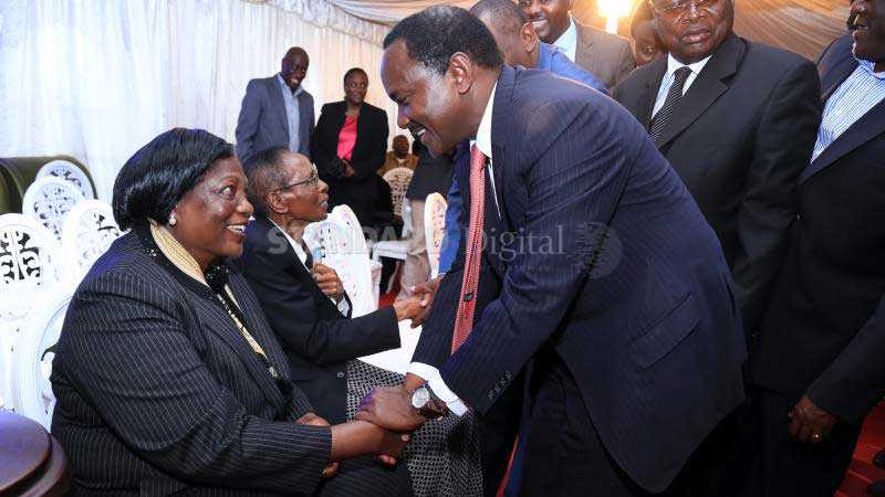 Wiper Democratic Movement Leader Kalonzo Musyoka shake hands with Mama Ngina Kenyatta when they met at the home of the late Kenneth Matiba in Limuru, Kiambu yesterday. [Dennis Kavisu, Standard]