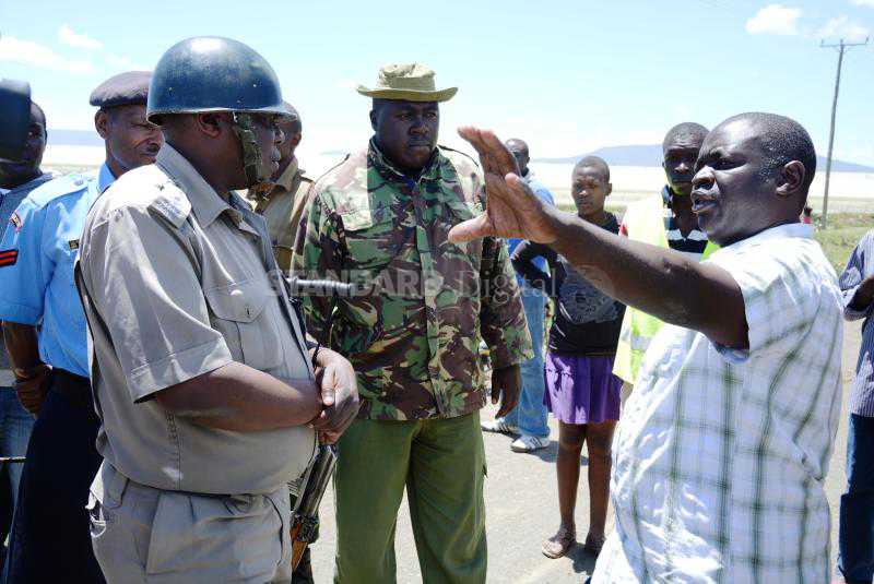 Chairman Lake Naivasha boat owners association David Kilo (R) argues with anti-riot police officers when he led members of the public in reopening a grabbed public corridor leading to Lake Naivasha. [Antony Gitonga/Standard]