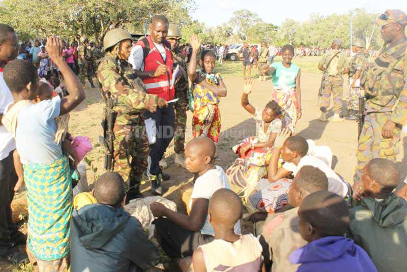 KDF and Kenya Red Cross officials in consultations with flood victims at Magarini's Garachi secondary school grounds in Kilifi County on Thursday, 26th April, 2018. Over 3,000 families marooned by floods at Garachi villages were rescued by KDF. [Nehemiah Okwembah,Standard]