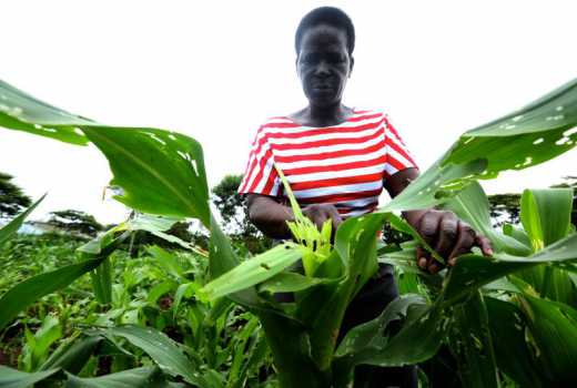 Jane Kisia, a farmer at Korowe village in Nyando Kisumu county at her maize farm that has been largely invaded by the deadly fall army warms. (Collins Oduor, Standard)