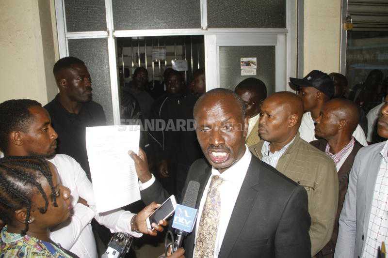 Kenya National Union of Teachers (KNUT) Secretary General Wilson Sossion adresses media after he was blocked from accessing his office on Nairobi's Mfangano Street. [Willis Awandu/Standard]