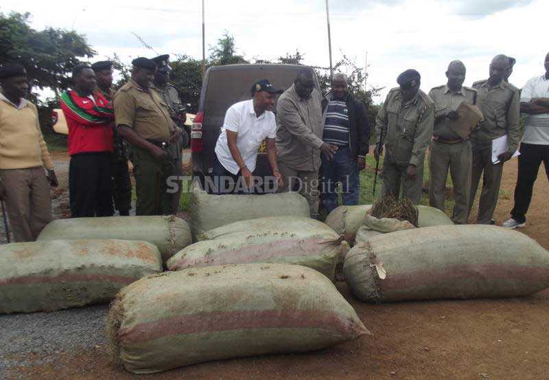Kiambu County Police Commander Adiel Nyange showing Thika MP Patrick Wainaina (in white) bhang that was impounded by police. [KAMAU MAICHUHIE, STANDARD]