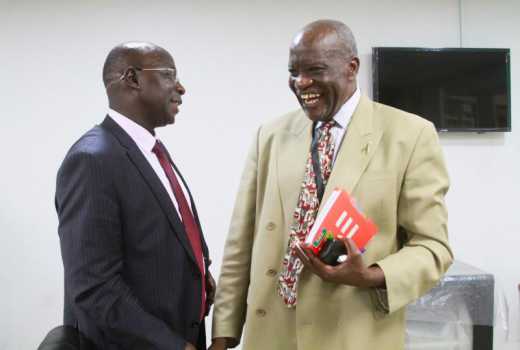 Senate Health Committee Chairman Michael Mbito (left) chats with World Bank Lead Health Specialist Dr.Khama Rogo on the health care financing and achieving UHC at Red Cross building on Tuesday. [Boniface Okendo, Standard]