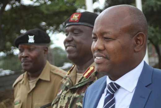 Kajiado county Commissioner David Kipkemei (right) and other Administration senior officers address the press outside his office in Kajiado on 26th May 2018 shortly after he announced the interdiction of two chiefs for participating in unlawful early marriage of a nine-year-old girl at Esonorua area Kajiado West Sub County. PETERSON GITHAIGA
