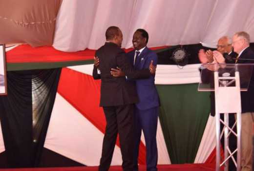 President Uhuru Kenyatta and Raila Odinga hug during National Prayer Breakfast.
