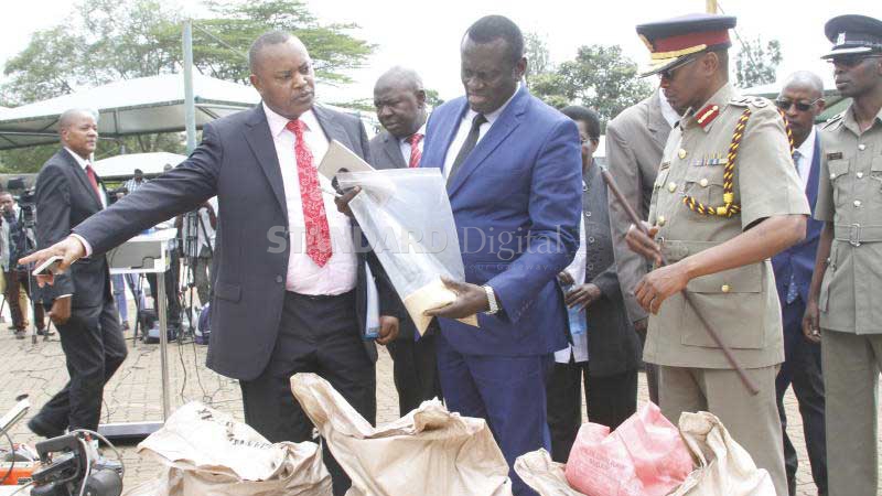 Inspector General of Police Joseph Boinnet (Right), Directorate of Criminal Investigation (DCI) George Kinoti (left) and Deputy Public Health Commissioner Wanyama Musiambo (centre) inspect some of over 2,000 bags of contraband sugar impounded in a warehouse in Nairobi. [Willis Awandu, Standard]