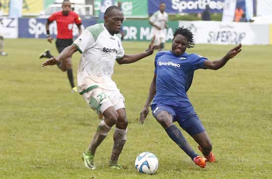 Sportpesa Supercup:Gor Mahia Vs Sangida United Meddie Kagere (left) of Gor Mahia battles for the ball with Salum Kipaga of Singida United during the sportpesa Supercup at Afraha Stadium in Nakuru on June 7,2018.Photo:Kipsang Joseph/Standard