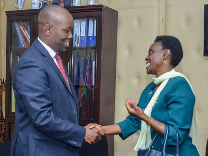 Nakuru Governor Lee Kinyanjui with Commission on Revenue Allocation chairperson Jane Kiringai at the county headquarters. [Joseph Kipsang, Standard]