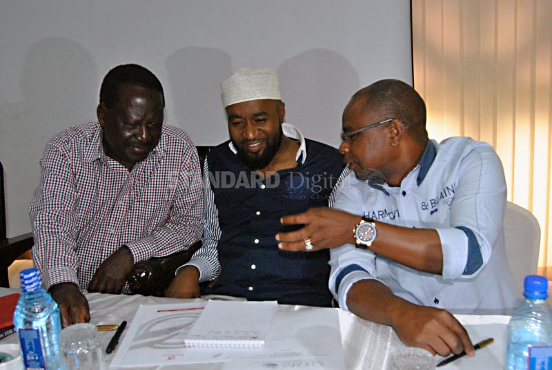 Orange Democratic Party leader Raila Odinga (left) his deputy, Ali Hassan Joho (centre) and Kilifi County Governor Amason Kingi chat during the party's joint meeting of the National Executive Council and Parliamentary Group at Flamingo beach hotel in Mombasa. [Omondi Onyango/Standard]