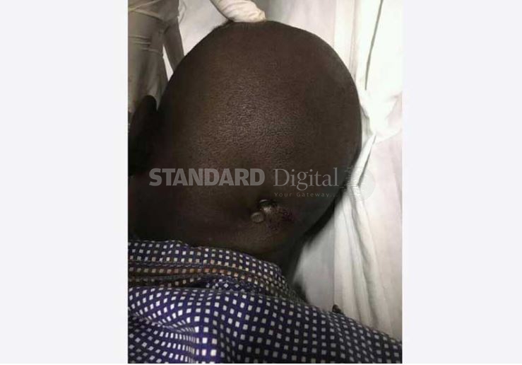 Photo of Robert Muchangi, 28, showing the two nails hammered into his head by attackers. [Darlington Manyara/ Standard]