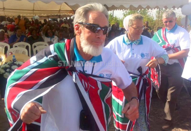 Members of ''well of hope international'' Non-Governmental Organization from the United State of America, shows their dancing skills shortly after they commissioned a water bore hole at Naro Moru village in Kajiado west. [Peterson Githaiga/Standard]