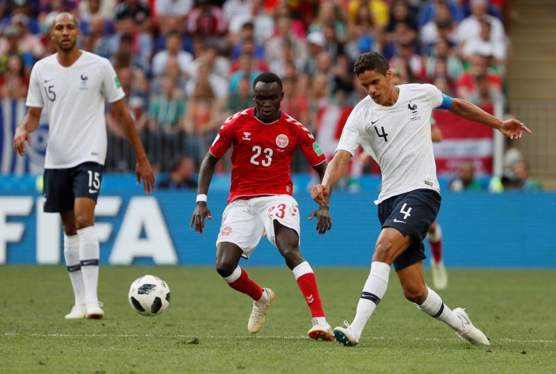 Soccer Football - World Cup - Group C - Denmark vs France - Luzhniki Stadium, Moscow, Russia - June 26, 2018 France's Raphael Varane in action with Denmark's Pione Sisto REUTERS/Gleb Garanich