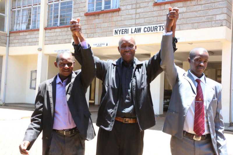 ACK Archdeacon John Njogu Gachau (center) Rev Paul Mwangi Warui (right) and Rev James Maina Maigua (left)celebrate outside the Nyeri Law Court on September 9,2016, after Justice Bryam Ongaya ordered the church to reinstate them. [PHOTO:KIBATA KIHU/STANDARD].