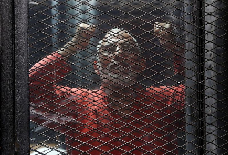 Muslim Brotherhood's leader Mohamed Badie shouts slogans against the Interior Ministry behind bars during the trial of 738 brotherhood members for their armed sit-in at Rabaa square, at a court on the outskirts of Cairo, Egypt on May 31, 2016. [Reuters]